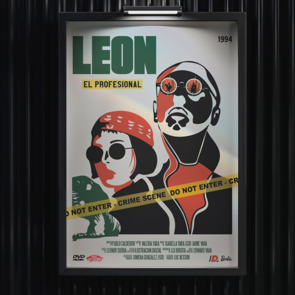 Afiche de Léon: El Profesional reinterpreta la película con una ilustración digital de alto contraste. La composición une imagen, paleta cromática y tipografía de forma limpia, creando un póster fuerte y fiel al tono de la película.